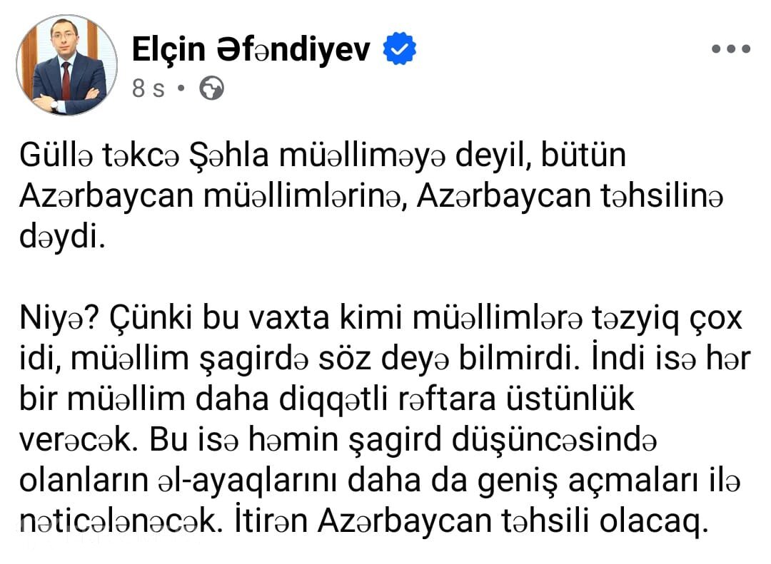 1xeber.media xəbər verir ki, bunu bu gün "İdrak" liseyində şagirdin müəllimi güllələməsinə münasibət bildirən təhsil eksperti Elçin Əfəndiyev özünün Facebook səhifəsindəki paylaşımında bildirib: