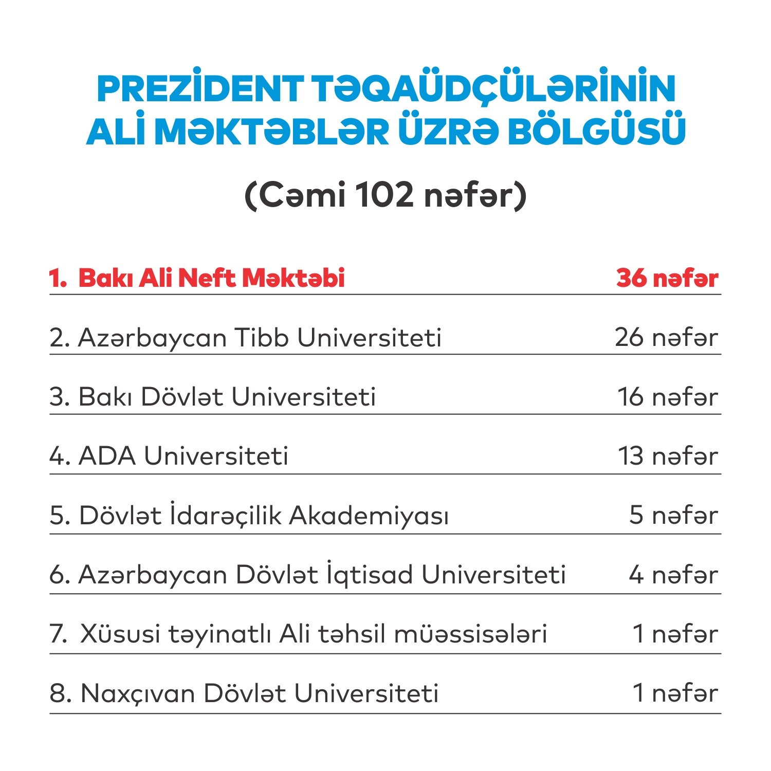 1xeber.media xəbər verir ki, ölkə üzrə Prezident təqaüdünə layiq görülən tələbələrin sayı 102 nəfərdir.